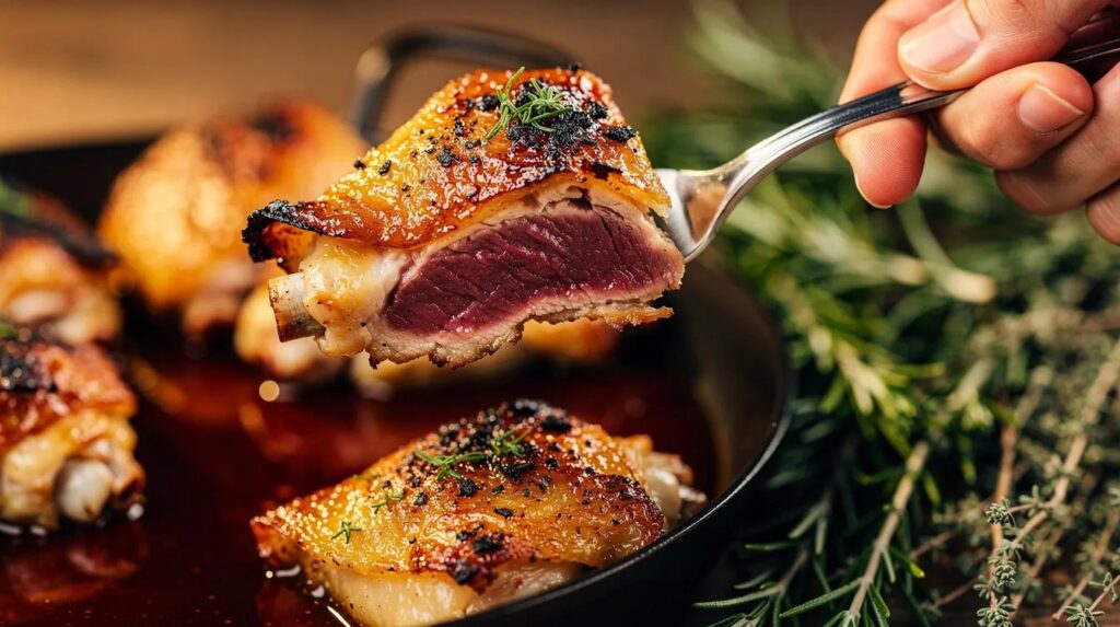 Pat the thighs dry with paper towel before seasoning. Moisture is the enemy of crisp skin. If you have time, leave them uncovered on a plate in the fridge for an hour — or even overnight. The dry air of the refrigerator draws surface moisture away, and the difference is noticeable. Always start them skin-side up, and resist the temptation to flip unless a recipe specifically calls for it.