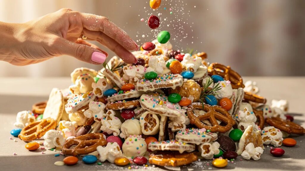 Tip the pretzels, cereal and popcorn into the large mixing bowl. Use your hands — gently — to toss everything together so the shapes are evenly distributed. You want a mix of textures here: the dense snap of pretzel, the airy crunch of cereal, the pillowy chew of popcorn. If any popcorn kernels slipped through, fish them out now. A stray unpopped kernel is nobody's friend.