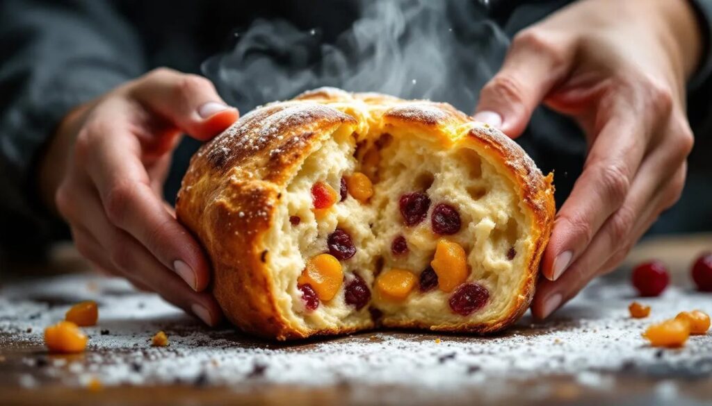 Reduce the mixer to its lowest speed and add the dried fruit, candied peel and orange zest. Mix for no more than 2 minutes: the goal is even distribution, not further gluten development. If you are working by hand, turn the dough onto a lightly floured surface and fold the fruit in using a stretch-and-fold technique — stretching one edge of the dough out, folding it back over the centre, rotating 90 degrees and repeating — until the fruit is evenly dispersed throughout. The dough will feel noticeably enriched: pliant, faintly glossy from the butter and eggs, dotted with deep-coloured fruit.
