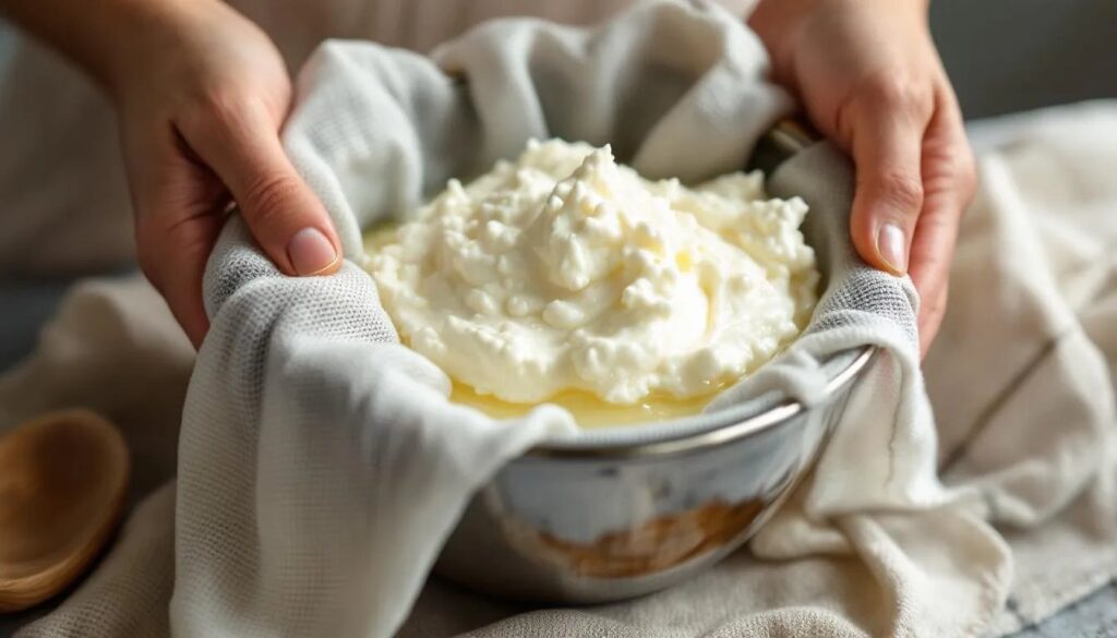 Before heating anything, prepare your straining setup. Line the fine-mesh strainer with two layers of cheesecloth — or a clean, damp cotton kitchen towel, which works just as well — and set it over a large bowl deep enough to hold the whey without the strainer touching the liquid. Having this ready before the milk reaches temperature means you lose no time once the curds form, which matters because curds that sit in hot acidic whey too long can turn rubbery. Place it near the stove within easy reach.
