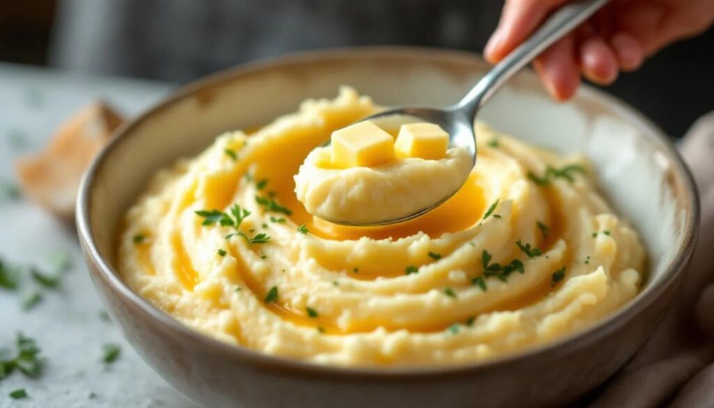 Once the butter is fully incorporated, add the warmed milk or cream in a slow, steady stream, folding rather than beating. Warm liquid is non-negotiable here: cold dairy shocks the emulsion you have just built, causing the butter fat to seize and the mixture to stiffen unevenly. Add only as much liquid as needed to reach your preferred consistency — some prefer a dense, almost sculptural purée, others a pourable, flowing one. Season with salt and white pepper, tasting after each addition. The mash is ready when it falls from the spoon in slow, thick ribbons.
