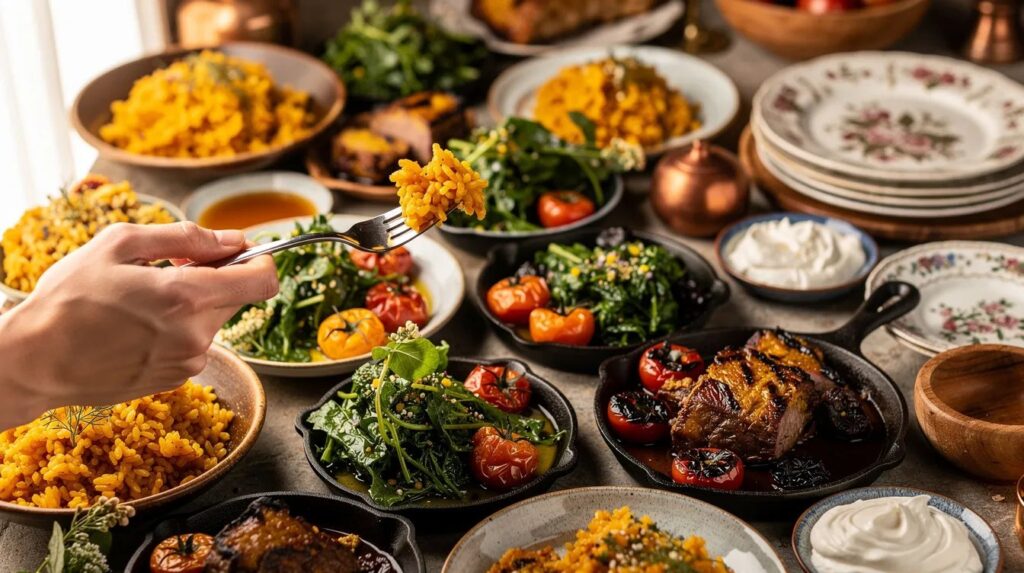 The beauty of this approach lies in flexibility. For a group of 6–8, choose the lamb, two sides, and the crumble. For a larger gathering of 10–12, add the tart and the burrata plate. For a vegetarian table, omit the lamb entirely and let the mushroom tart take centre stage, flanked by the pumpkin, the freekeh salad, and the burrata. Nearly everything here can be made ahead. The freekeh salad improves with time, the pumpkin reheats well, the lamb rests happily under foil, and the crumble can be assembled and baked while the main courses are cleared. Set the dishes out on the table at once, pass plates, and let people choose their own combinations. A feast like this has no rules, only abundance.