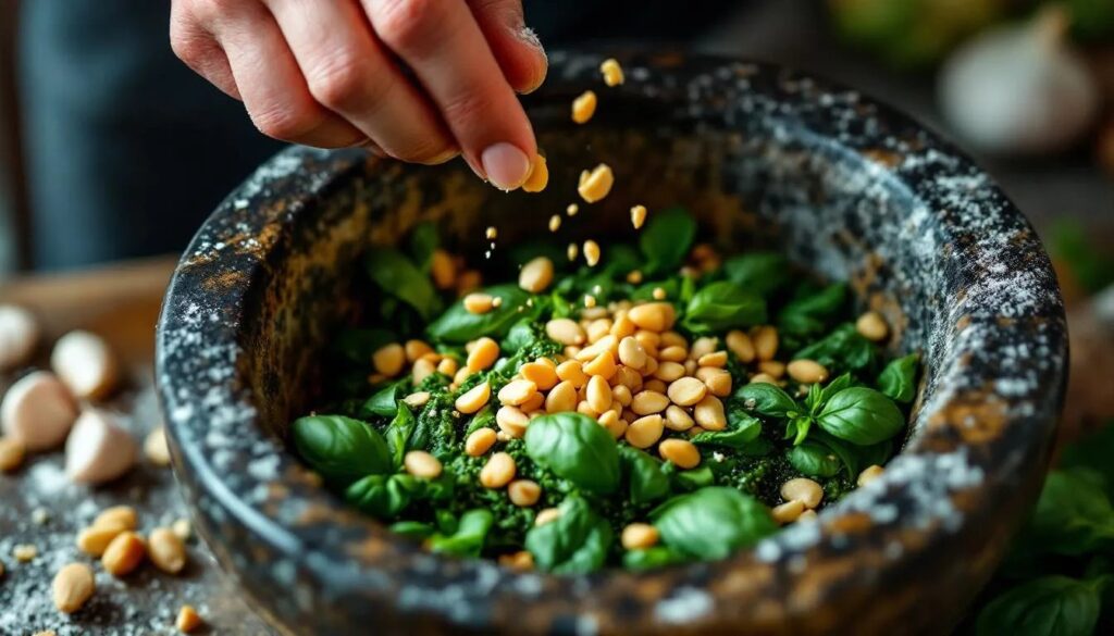 Pesto alla Genovese takes its name from the Ligurian city of Genoa and, more precisely, from the verb pestare — to pound, to crush. The mortar and pestle version predates the food processor by centuries: the original technique involved grinding garlic first into a paste, then adding coarse salt as an abrasive, then the basil, always in the same order, always by hand. The result was an emulsion produced entirely through mechanical force and patience, with a slightly more rustic, fibrous texture than anything a blade can produce. The specific basil used in the most traditional preparations is Basilico Genovese DOP, a variety with small, curved leaves and a delicate, almost floral sweetness that differs markedly from the large-leafed varieties common in supermarkets elsewhere in Europe and the United States. The pine nuts — pinoli — are those of the Mediterranean stone pine, smaller and more resinous than East Asian varieties, which tend to be blander and have been linked in some individuals to a temporary taste disturbance known as pine mouth syndrome. Beyond Liguria, regional Italian variations include a Sicilian version built on tomatoes, almonds and basil, and a Trapanese pesto that is closer to a raw sauce than a condiment. Modern kitchens around the world have extended the logic of pesto — fat, nut, herb, hard cheese, acid or salt — to rocket, kale, pistachios, walnuts, and cashews, each producing something distinct but recognisably part of the same family of quick, cold-blended sauces.