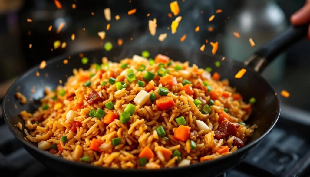 Technique in the wok is just as critical as the rice itself. Most restaurant cooks follow a consistent sequence: aromatics first, protein second, rice third, sauce last. Each step serves a structural purpose.